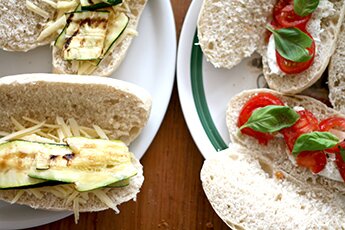 Je kunt de broodjes beleggen met ingrediënten naar keuze, maar zorg ervoor dat ze niet te nat, maar wel gaar zijn. Laat buffelmozzarella bijvoorbeeld goed uitlekken en gril de courgette of aubergine voordat je de broodjes ermee belegt.