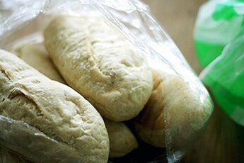 Je moet witte afbakbroodjes kopen; het liefst die nog erg zacht zijn en zich makkelijk plat laten drukken. Bakkerij ’t Stoepje (op de markt) heeft ze in de koeling of vriezer, vraag erom!