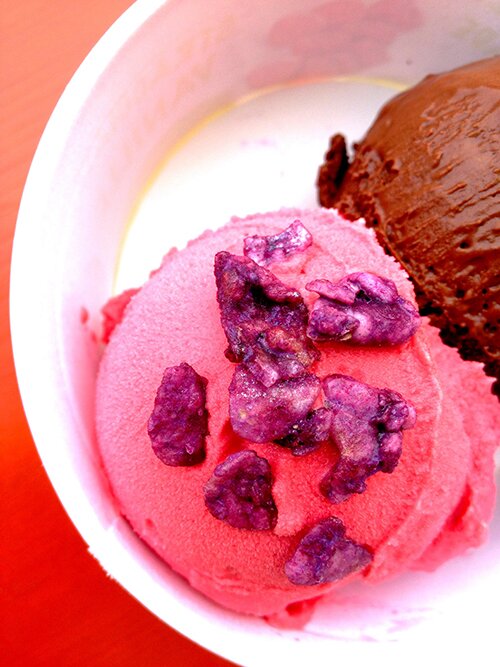Dit ijsje at ik vandaag bij Soetenso in Leiden: rozensorbet met kersen en specerijen. Maker Nils moest zelfs naar achteren omdat het nog niet eens in de vitrine lag. Ik was er speciaal voor langs gekomen, omdat ik al een tijdje vroeg om rozenijs en hij het nu ein-de-lijk gemaakt had. Op het ijsje ligt viooltjessuiker.